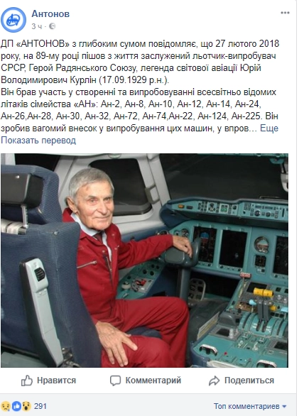 «Госпредприятие „Антонов“ с глубоким прискорбием сообщает, что 27 февраля 2018 года на 89-м году ушел из жизни заслуженный летчик-испытатель СССР, герой Советского союза, легенда мировой авиации Юрий Курлин», — говорится в сообщении на странице предприятия в Facebook.