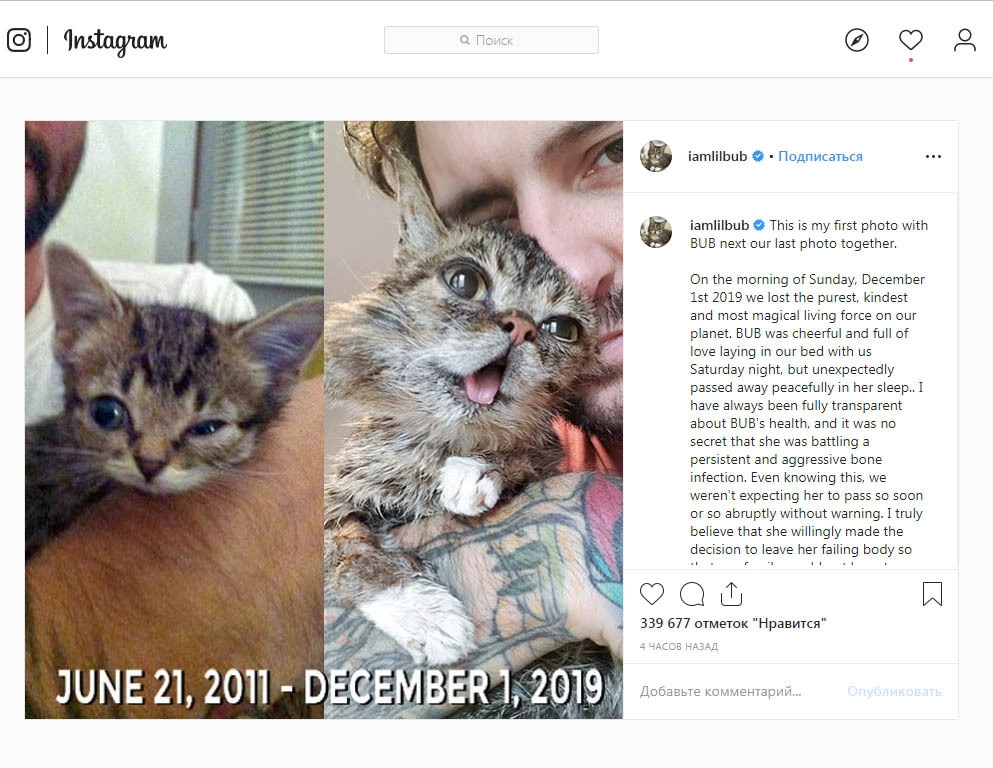 Одна из самых известных кошек интернета — Лил Баб (Lil Bub) — умерла в возрасте восьми лет утром 1 декабря. О ее смерти сообщил в Instagram хозяин — музыкант Майк Бридавский.