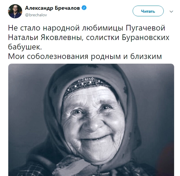 «Не стало народной любимицы Пугачевой Натальи Яковлевны, солистки „Бурановских бабушек“. Мои соболезнования родным и близким», — написал в своем Twitter губернатор Удмуртии Александр Бречалов.