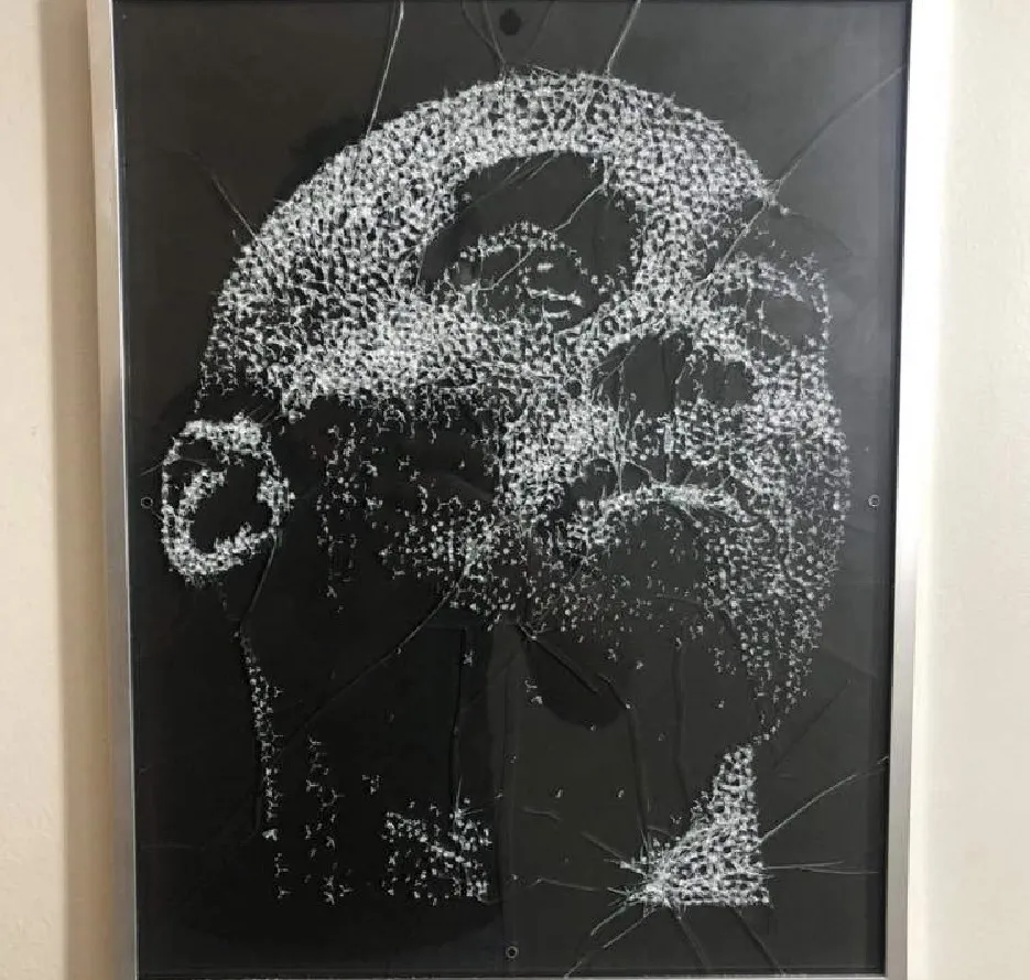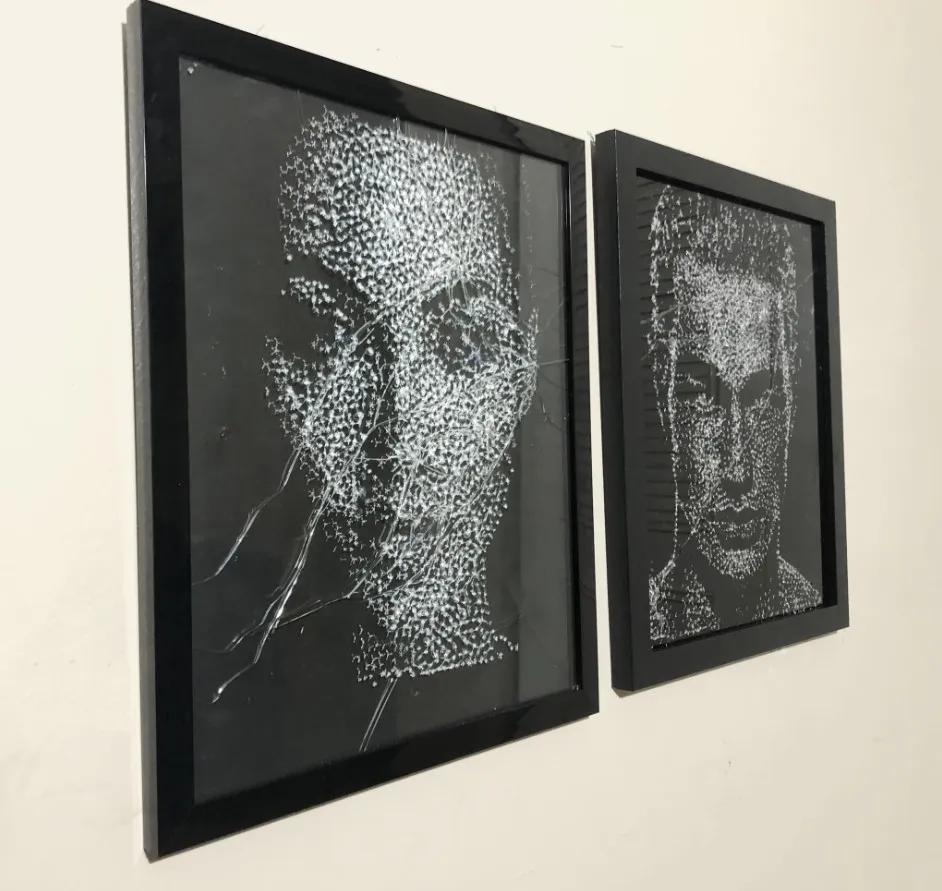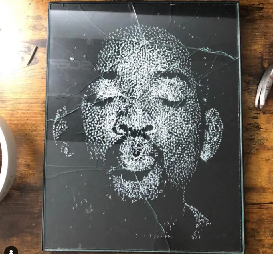 Чтобы создать картину, Натнаэль сначала наносит контур, а затем продолжает делать небольшие трещины в стекле, ударяя по нему с разной силой и постепенно превращая их в портрет человека.