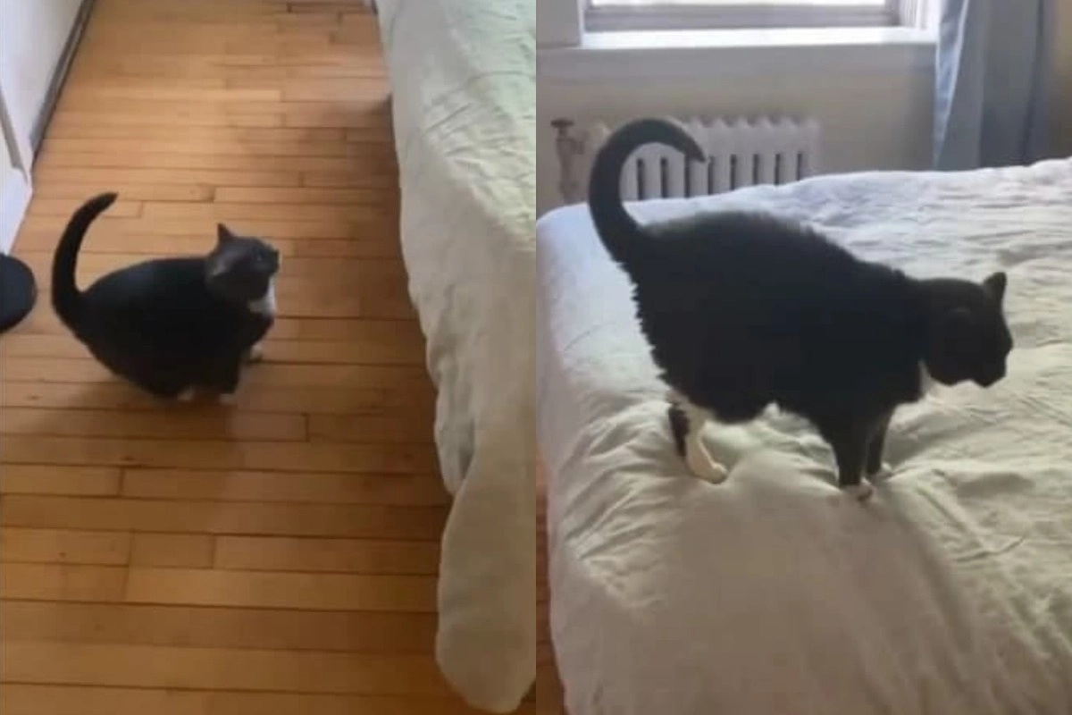 Уморительные попытки кошки запрыгнуть на кровать попали на видео