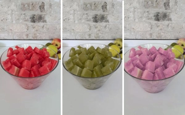 1. Как арбуз видят обычные люди. 2. Как его видят люди с дальтонизмом. 3. Как приложение меняет цвета, чтобы для дальтоника зеленый превратился в подобие красного.