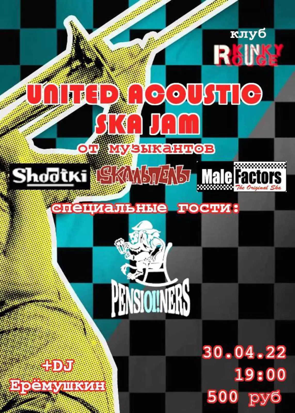 В Москве в субботу, 30 апреля, состоится акустический джем-сейшен. Подобные музыкальные импровизации характерны для блюзменов. Тем и будет уникален предстоящий концерт. Ведь на сцену клуба Kinky Rouge с разной интенсивности акустическими сетами выйдут популярные в столице ска-коллективы «SKAльпель», Male Factors и Shootki.