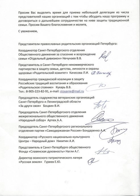 «Дорогой Владыка! В начале 2015 года должны состоятся выборы на пост Уполномоченного по правам ребёнка в Петербурге. Губернатор вновь выдвинул Светлану Агапитову на пост защитника прав наших детей. Мы — родительская общественность Петербурга — с негодованием восприняли этот факт и убеждены, что Георгий Сергеевич Полтавченко не в полной мере осведомлен о деятельности Светланы Агапитовой на посту детского омбудсмена. Убеждены, что если перевыборы произойдут, духовное растление наших детей продолжится и заступиться за них опять будет некому.