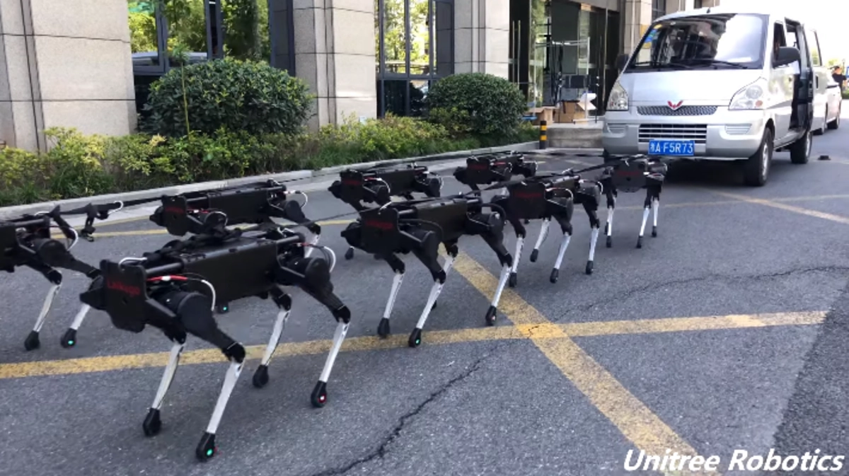 В новом видео от китайской компании Unitree Robotics восемь собакоподобных роботов тянут за собой микроавтобус китайской марки Wuling Motors. За рулем автомобиля никого не было, зато в салоне находились пассажиры.