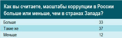 Дело в том, что социологи разделили респондентов на две части: 800 человек отвечали на вопрос: «Как вы считаете, масштабы коррупции в России больше или меньше, чем в странах Запада?», еще 800 — на встречный: «Как вы считаете, масштабы коррупции в странах Запада больше или меньше, чем в России?»