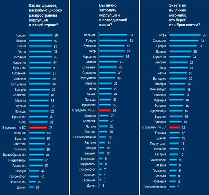 Но как считают сами жители стран Запада? Евробарометр периодически, хотя и не так часто, как мы, исследует коррупцию в ЕС.