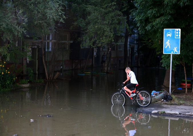 Ребенок катается на велосипеде в одном из затопленных паводковыми водами районов Хабаровска. © Вячеслав Реутов/РИА Новости