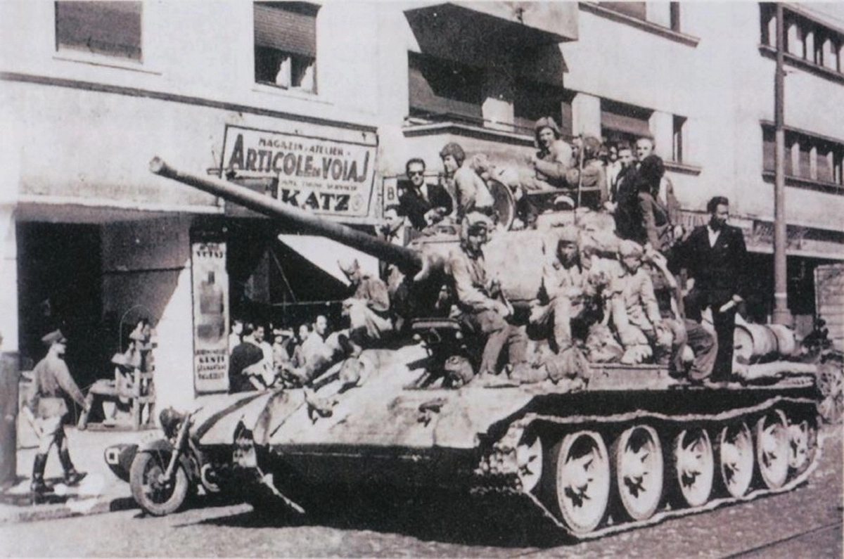 Танк Т-34-85 5-го гвардейского танкового корпуса на улице одного из румынских городов, август 1944 года. tankfront.ru