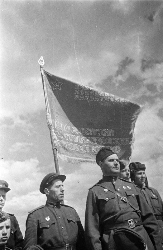 Группа военнослужащих у развёрнутого знамени 5-го гвардейского Сталинградского танкового корпуса. Третий справа — генерал-майор танковых войск Андрей Григорьевич Кравченко (1899–1963), командовавший корпусом с 18 сентября 1942 по 24 января 1944 года. Затем командовал 6-й танковой, а после — 6-й гвардейской танковой армией. Фотограф С. Фридлянд. waralbum.ru