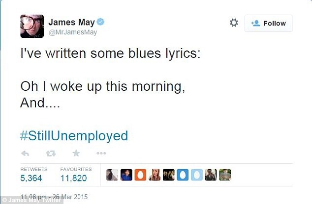 Следуя за «фронтмэном» троицы ведущих Top Gear Джереми Кларксоном, Джеймс Мэй также решил покинуть шоу — теперь он играет на блок-флейте и рассказывает подписчикам своего блога о тяготах безработной жизни.