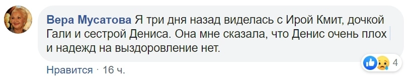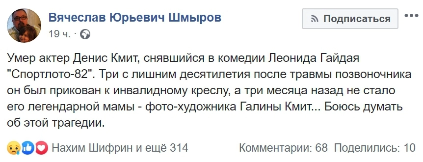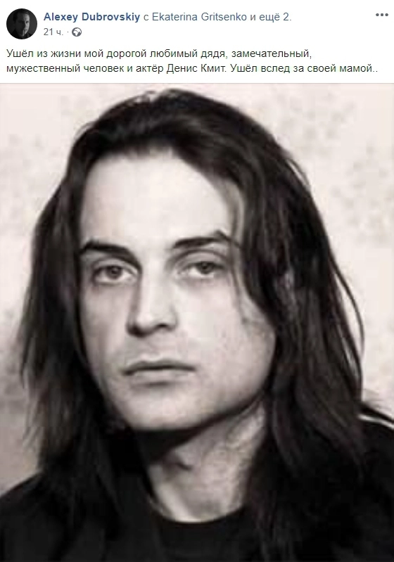Ушел из жизни мой дорогой любимый дядя, замечательный, мужественный человек и актер Денис Кмит. Ушел вслед за своей мамой… — сказано в посте актера Алексея Дубровского, опубликованном в Facebook накануне.