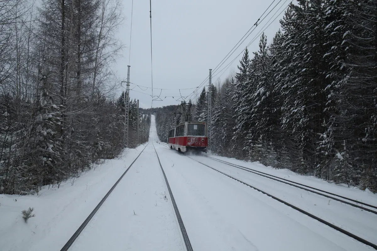 Расскажу для тех, кто не знает, чем ценен именно усть-илимский трамвай. Если бы это была какая-нибудь рядовая система, я бы вряд ли поехал через всю страну, ещё и в конец года, когда завален просто делами. Но этот трамвай интересен был бы многим, не только фанатам: он идёт около десяти километров по глухой тайге, возит рабочих с деревообрабатывающего комбината по особому расписанию и считается «скоростным» (маршрутная скорость примерно 24 километра в час). На линии — только системы из двух вагонов (что уже стало большой редкостью в российских городах).