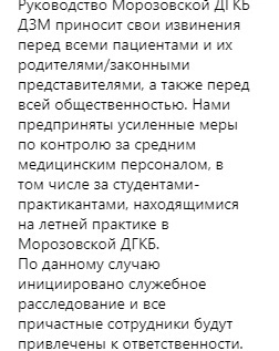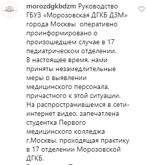 25 июня в интернете появилось видео, на котором, по словам публикаторов, медицинская сестра Морозовской больницы входит в палату с ребенком и совершает движение, похожее на шлепок, а затем связывает лежащему на кровати малышу руки. Опубликовавшая видео в Instagram женщина утверждает, что ребенка избили и затем привязали к кровати. На видео слышно, как мальчик кричит «не надо».