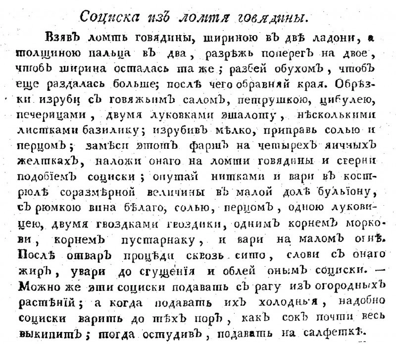 При этом автор говорит, что блюдо должно быть «подобием социски», что свидетельствует о том, что классическую сосиску тогда тоже знали.