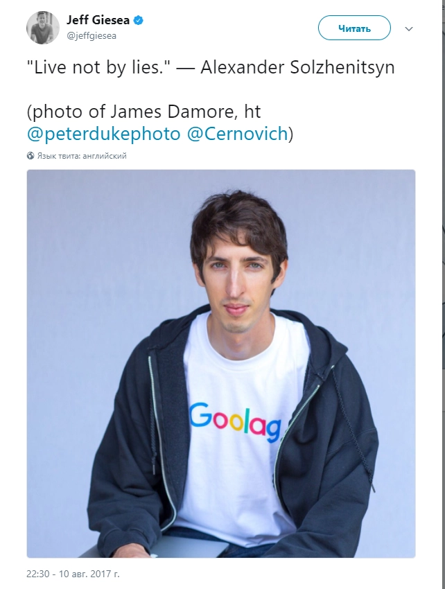 Инженер Джеймс Дамор, уволенный из Google за «сексизм», в знак протеста сфотографировался в футболке с надписью Goolag, обыграв логотип IT-гиганта. Снимок он опубликовал в Twitter.