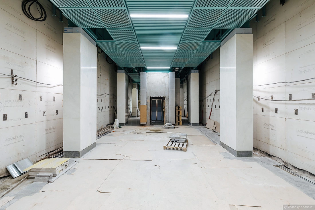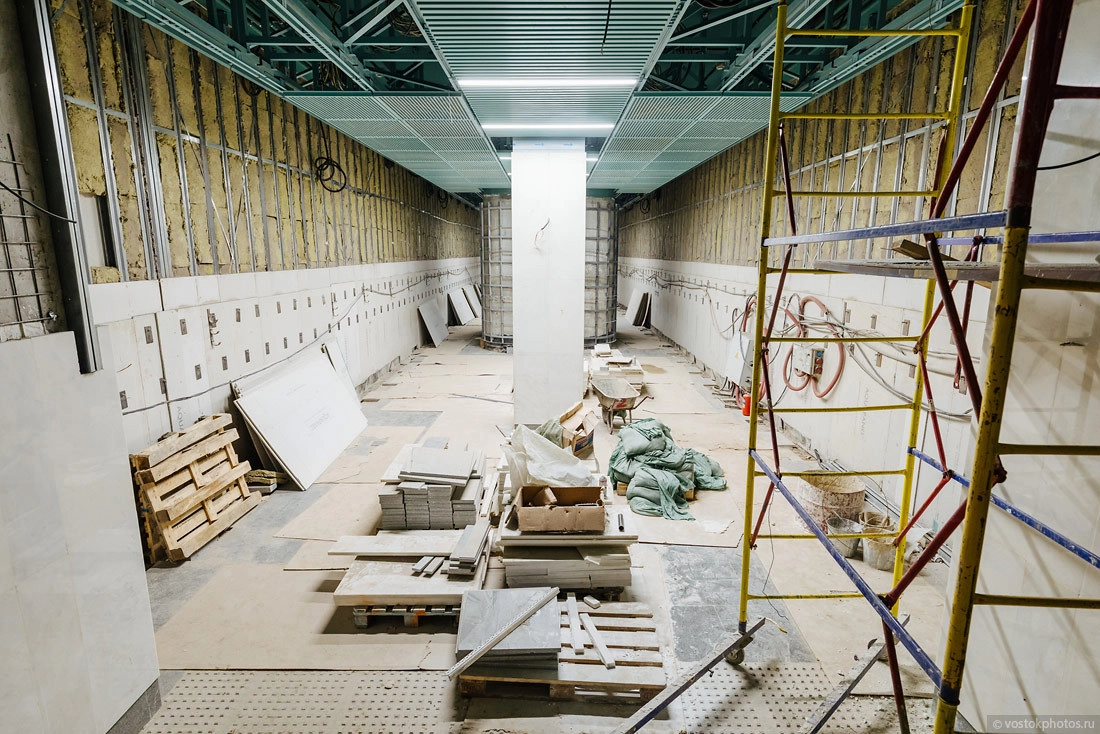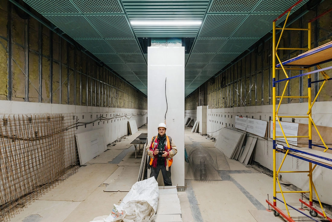 Первое, что бросается в глаза, — это сплошная стена на платформе, которая отгораживает основную стройку от действующего метро.