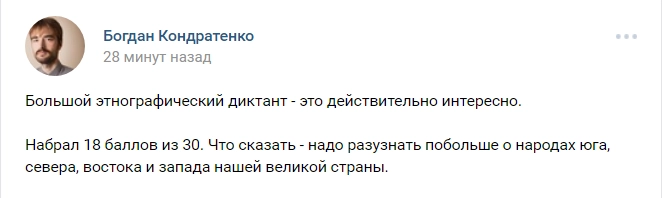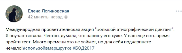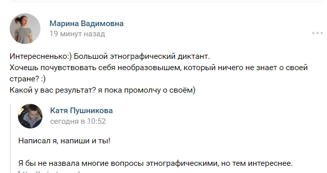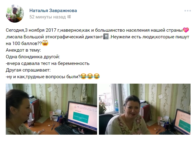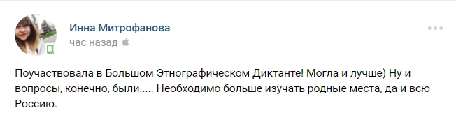 Те, кто уже написал диктант, хвастаются результатом в соцсетях. «Так себе из меня этнограф», «Диктант очень достойный», «Если честно, думала, что напишу хуже», — высказываются пользователи.