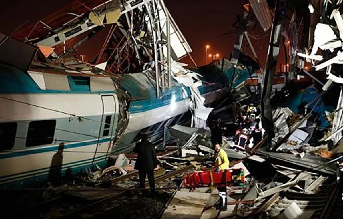 Турецкое информагентство Anadolu сообщает, что поезд врезался в путепровод, который в результате происшествия обрушился.