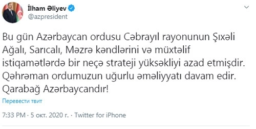 «Сегодня азербайджанская армия освободила села Шихали-Агали, Сариджали, Мазра Джебраильского района и несколько стратегических высот на разных направлениях. Успешная операция нашей героической армии продолжается. Карабах — это Азербайджан!» — написал в Twitter президент страны Ильхам Алиев.