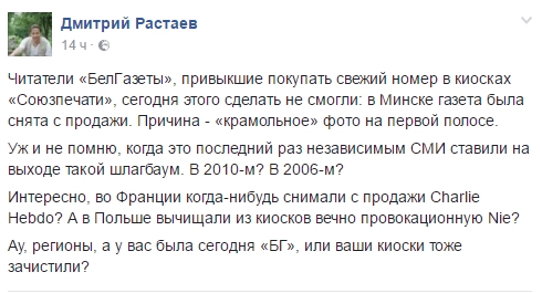 «Читатели „БелГазеты“, привыкшие покупать свежий номер в киосках „Союзпечати“, сегодня этого сделать не смогли: в Минске газета была снята с продажи. Причина — „крамольное“ фото на первой полосе», — написал он в Facebook.