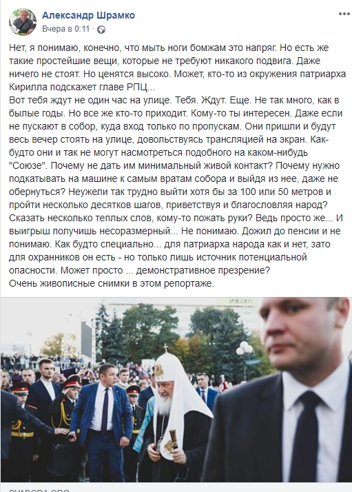 «Вот тебя ждут не один час на улице… Не так много, как в былые годы. Но все же кто-то приходит… Почему не дать им минимальный живой контакт? Почему нужно подкатывать на машине к самым вратам собора и выйдя из нее, даже не обернуться? Неужели так трудно выйти хотя бы за 100 или 50 метров и пройти несколько десятков шагов, приветствуя и благословляя народ? Сказать несколько теплых слов, кому-то пожать руки? Ведь просто же. И выигрыш получишь несоразмерный. Не понимаю. Дожил до пенсии и не понимаю. Как будто специально… Для патриарха народа как и нет, зато для охранников он есть — но только лишь как источник потенциальной опасности. Может, просто демонстративное презрение?» — высказался Шрамко.
