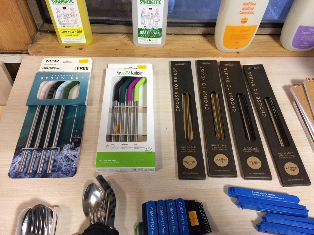 С одной стороны, в экоцентре можно приобрести вещи для многоразового использования, чтобы беречь природу от одноразового пластика. В частности, здесь есть возможность купить разные многоразовые стаканы для кофе, бутыли и даже… металлические трубочки для питья с ершиком для их чистки.