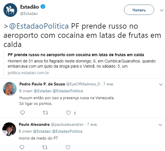 Однако в заголовках фигурирует только русский (у которого наркотиков было в 8 раз меньше). И это не паранойя; в комментариях бразильцев к данной новости мы видим именно ту реакцию, которую и следует ожидать от подогретой антироссийскими «вбросами» аудитории.