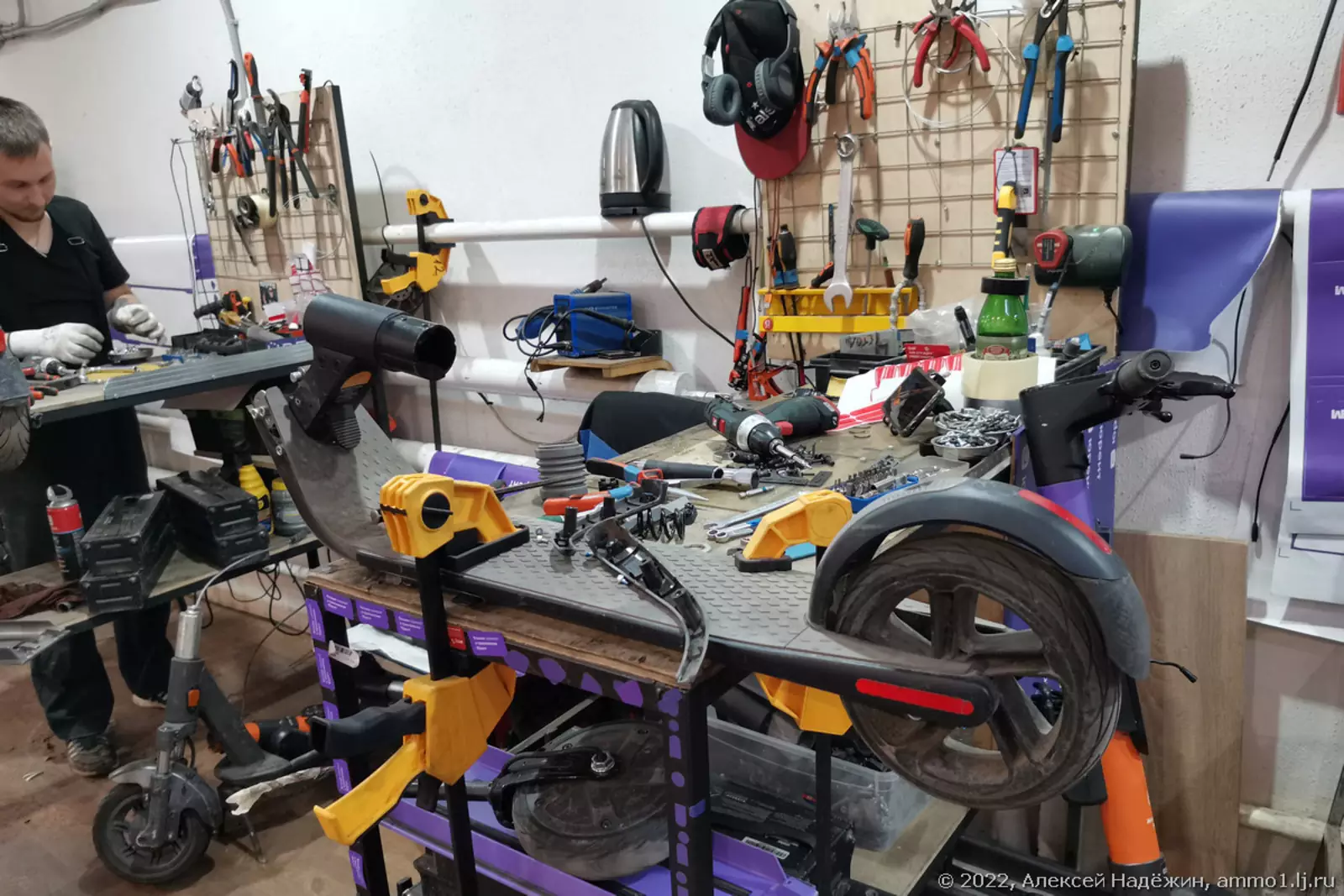Здесь более 20 мастеров с утра до вечера ремонтируют электросамокаты, и дело не в том, что самокаты так часто ломаются, а в том, что всем самокатам (а в Москве их 10 000) регулярно делается «профилактика».