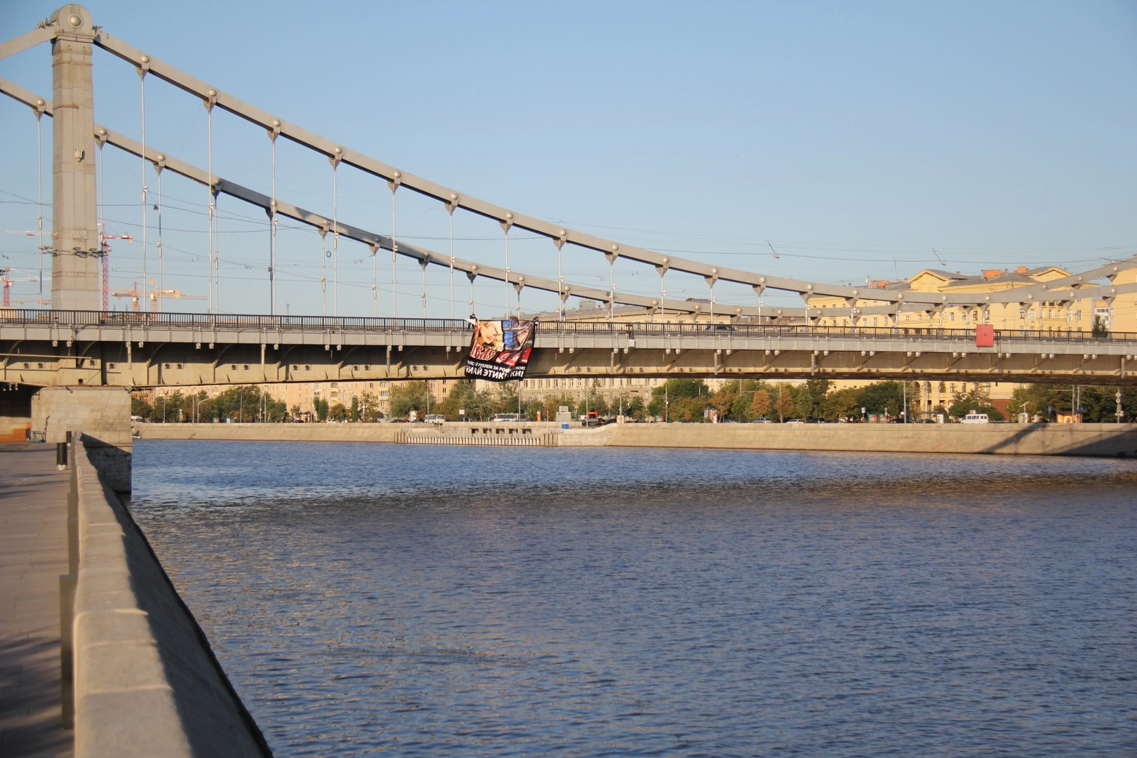 Громадный многометровый плакат был размещен утром в пятницу, несмотря, на бурные протесты охранников, полицейских, которых они вызывали, никто так и не дождался. Первыми приехали на ПАЗике «работяги» с инструментом, которые долго и с раздражением пытались демонтировать нашу инсталляцию, прикованную к мосту цепями.