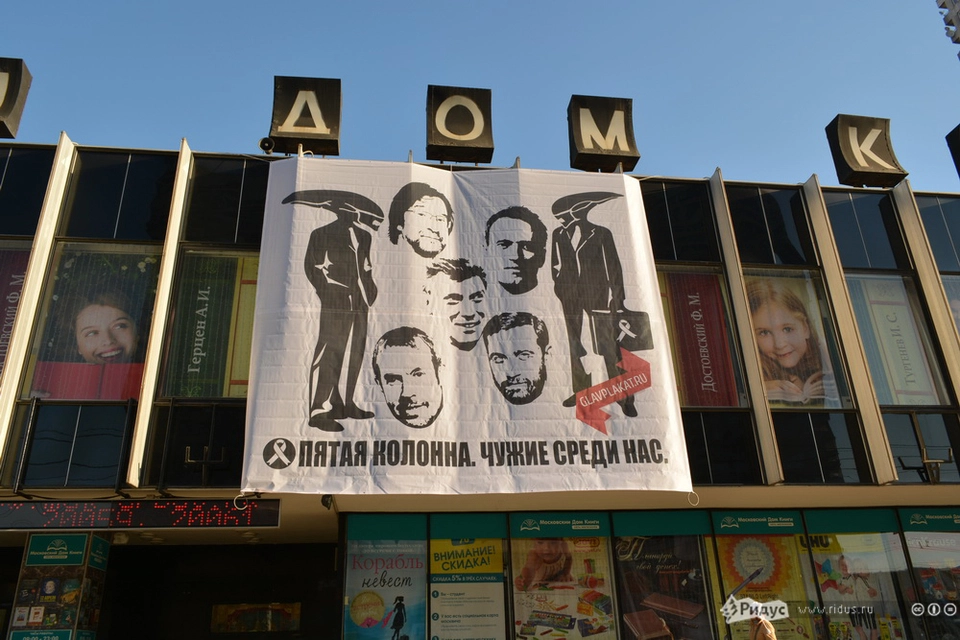 «Эти люди создают атмосферу нетерпимости», гласит 10-тиметровый баннер от «Главплаката», вывешенный напротив редакции радиостанции «Эхо Москвы» на Новом Арбате.