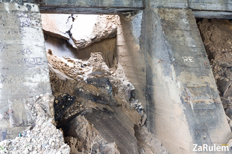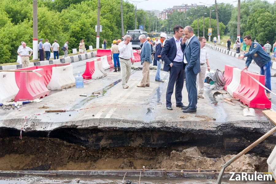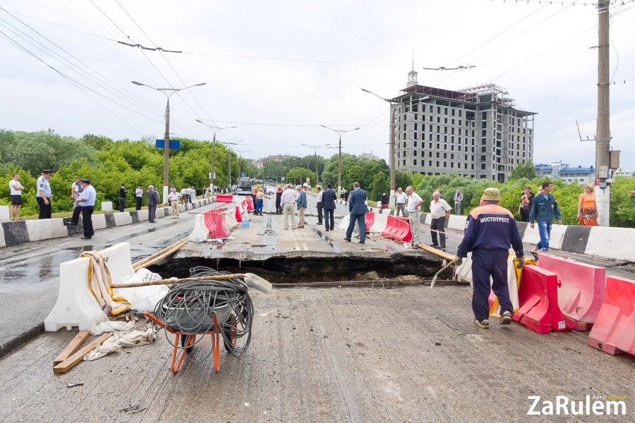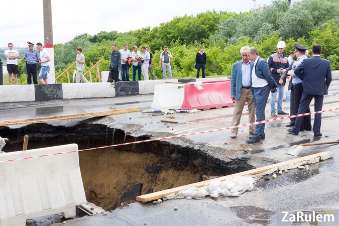 «К 12-00 часам полость засыпали песком, затем уложили бетон, но в 15-00 выпал обильный залп дождя. Несмотря на проведенные работы по отводу с полотна дороги дождевых потоков, вода попадала в образовавшуюся полость с действующей полосы движения. Сооружение не выдержало, и весь песок с бетоном смыло к основанию моста. Вновь образованная полость затронула часть основания проезжей части внешней полосы движения (разрушение достигло площади 9×3 метра глубиной 4 метра)», — комментирует главный инженер МБУ «Управление ЖКХ и благоустройства» Андрей Дьяков.