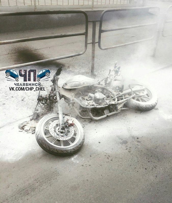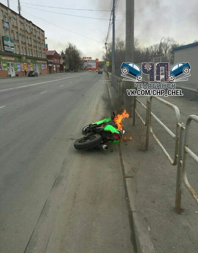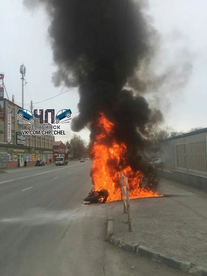 Пользователи Сети обсуждают снимки полыхающего мотоцикла, который загорелся при падении. Инцидент произошел в Челябинске возле одного из торговых центров.