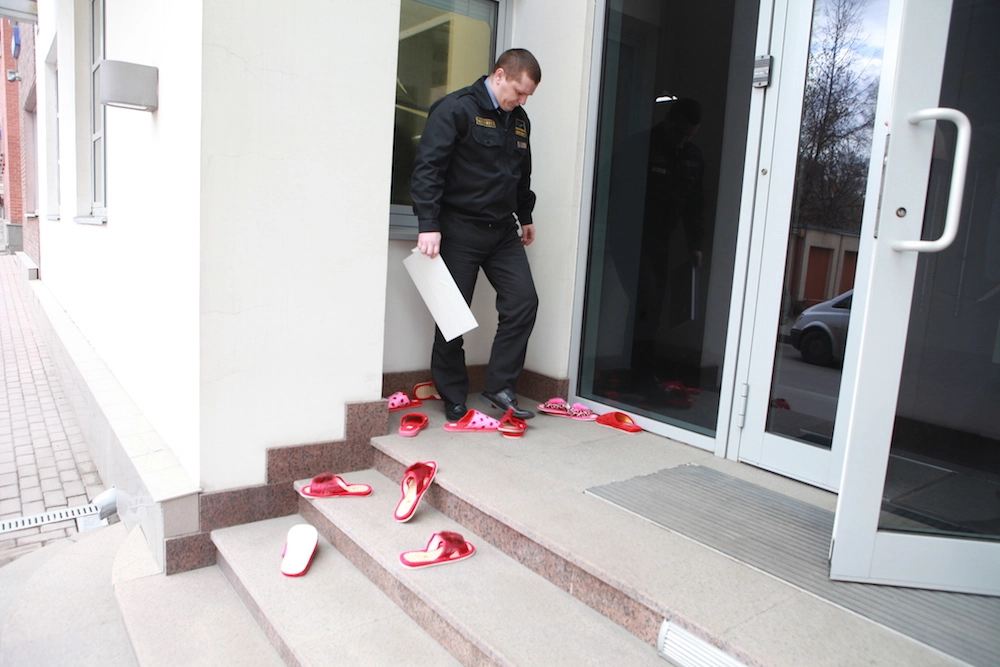 После «установки» таблички прохожие принесли и положили к ней десятки красных… тапочек, напомнив об одном из видеотворений Васильевой.