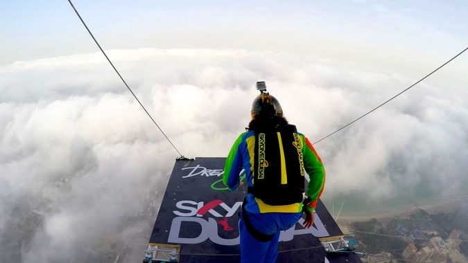 Участники события, организованного компаниями SkydiveDubai и XDubai, были одеты в специальную экипировку, включающую наколенники, налокотники и шлемы.