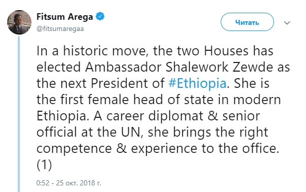 «Обе палаты парламента избрали посла Сахле-Ворк Зевде следующим президентом Эфиопии», — говорится в его сообщении в Twitter.