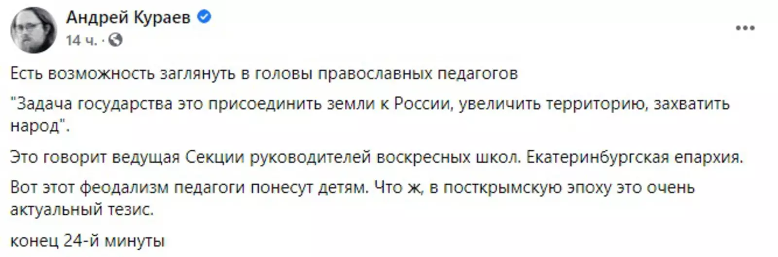 Внимание на высказывания Алены Богдановой обратил и запрещенный в служении бывший протодьякон РПЦ известный богослов Андрей Кураев.