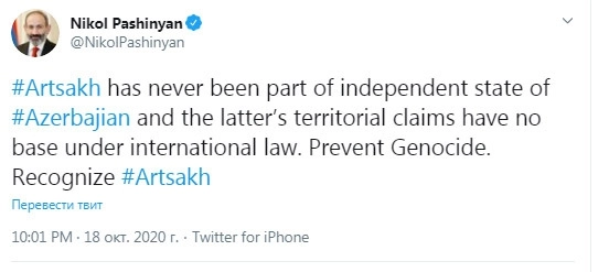 «Арцах никогда не входил в состав независимого государства Азербайджан, и территориальные претензии последнего не основаны на международном праве. Признать Арцах», — написал Пашинян в Twitter.