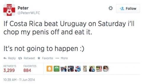 Тысячи ретвитов получил пост в микроблоге некоего PiterWLFC, который написал, что победа Коста-Рики настолько невероятна, что если она случится, он готов отрезать свой член и съесть его.