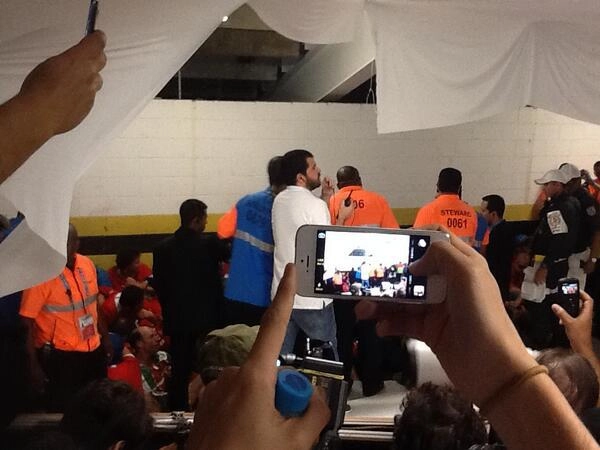 Максим Коротин: Перед началом матча между Коста Рикой и Англией у стадиона в Белу Оризонте наблюдал вот такую вот картину. Флаг Украины красиво пристроился между вывешенными флагами "поющих". Что он там делал и кто был его владельцем я так и не понял, но украинцы на мундиале мне запомнились именно этим. А сегодня на этом стадионе пройдет полуфинальный матч между Бразилией и Германией. Интересно появится ли сегодня живто-блакитное знамя около стадиона?
