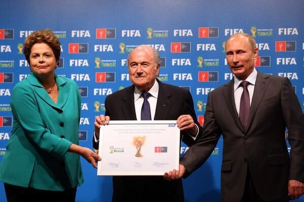 Президент Бразилии Дилма Русеф в присутствии главы ФИФА Йозефа Блаттера передала права Владимиру Путину, который побывал сегодня на финальном матче на "Маракане". Россия примет ЧМ-2018.