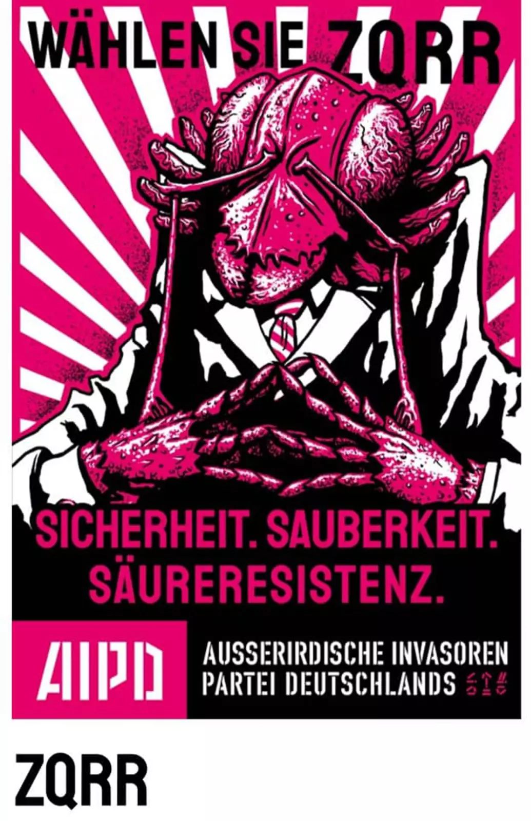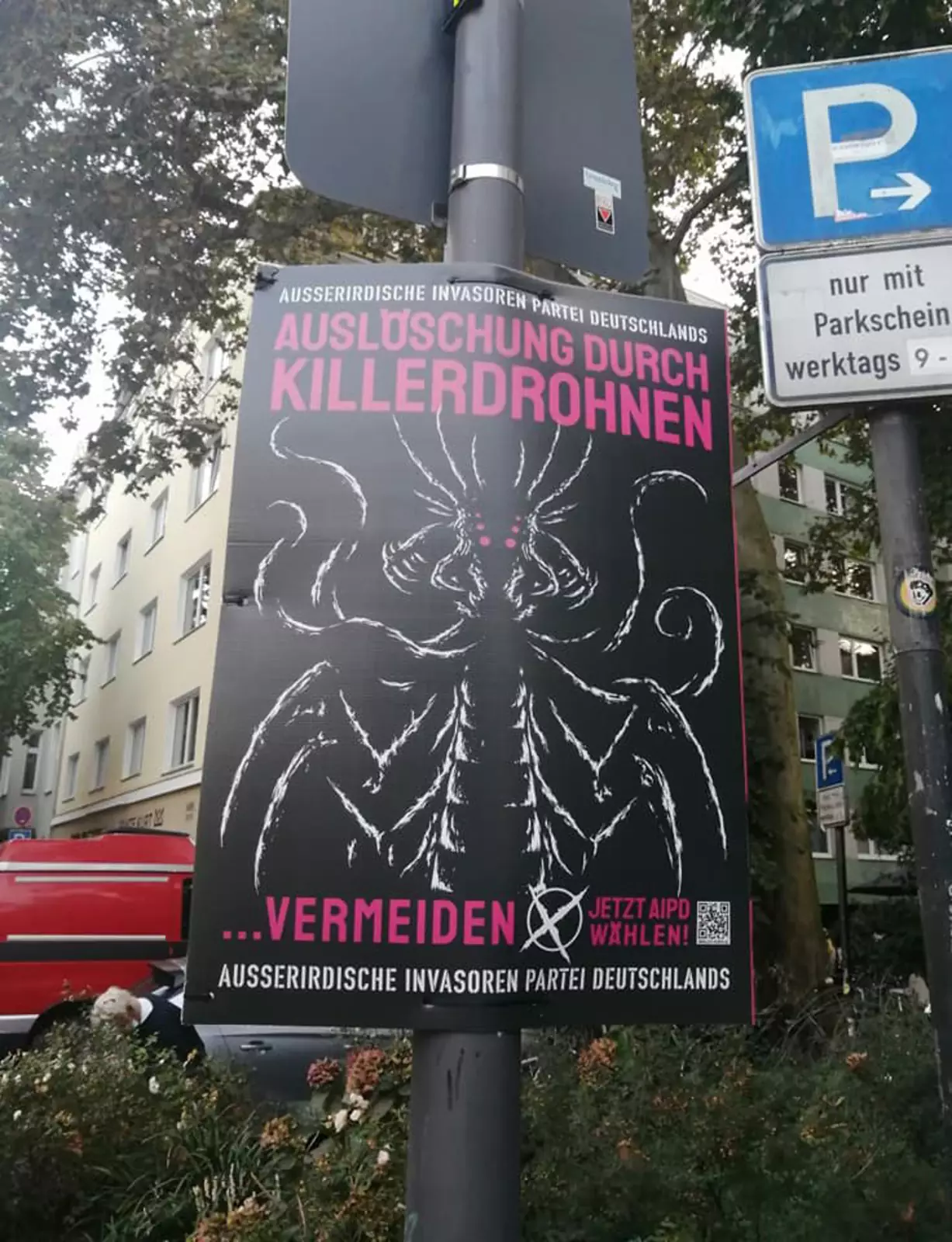 В Германии появилась новая партия AIPD, которая представляет инопланетных захватчиков. Их плакаты со слоганом «Свобода через подчинение!» расклеены в Кёльне едва ли не на каждом углу.