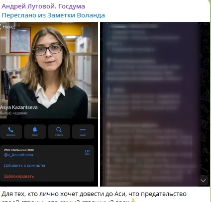 Тринадцатого декабря в официальном Telegram-канале Андрея Лугового появился репост из канала «Заметки Воланда», где были опубликованы персональные данные Аси Казанцевой — журналиста и авторитетного популяризатора науки. Пост содержит её номер телефона и возможные адреса.