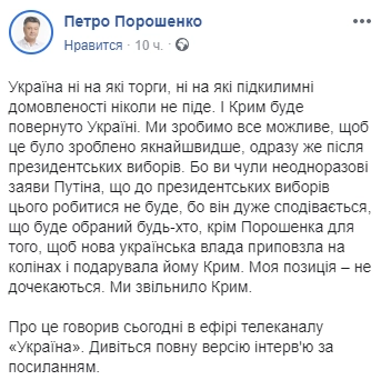 Ранее лидер Украины Петр Порошенко написал в соцсети Facebook, что сделает все возможное, чтобы вернуть Крым «как можно скорее, сразу после президентских выборов». «Моя позиция — не ждать», — отметил он.