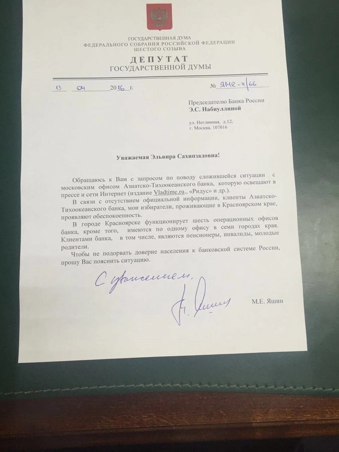 Депутат Госдумы от «Единой России» Михаил Яшин направил на имя главы Центробанка РФ Эльвиры Набиуллиной обращение, в котором попросил прояснить ситуацию с московским отделением Азиатско-Тихоокеанского банка, где побывали бойцы спецназа.