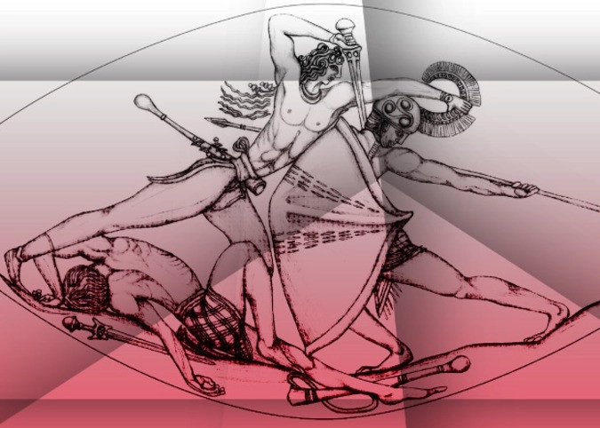 Вонзает кинжал - ага, метровой длины. Вонзает он ту самую микенскую "рапиру", найденную в могиле