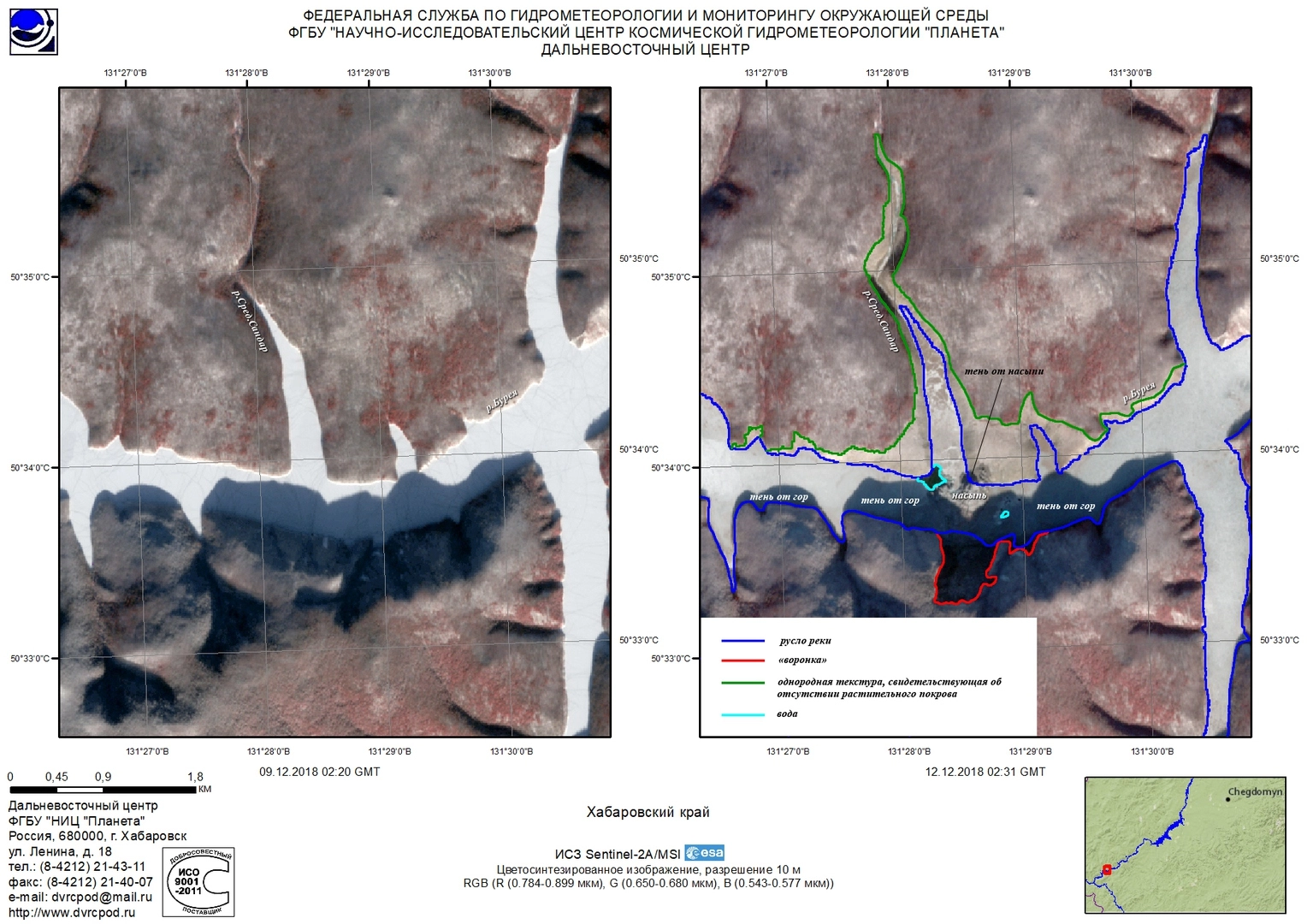 Так, специалисты Дальневосточного центра НИЦ «Планета», проанализировав спутниковые снимки за 9 и 12 декабря, констатировали, что форма прилегающей к реке сопки за этот промежуток времени серьезно изменилась. Определить это удалось по форме отбрасываемой ею тени.