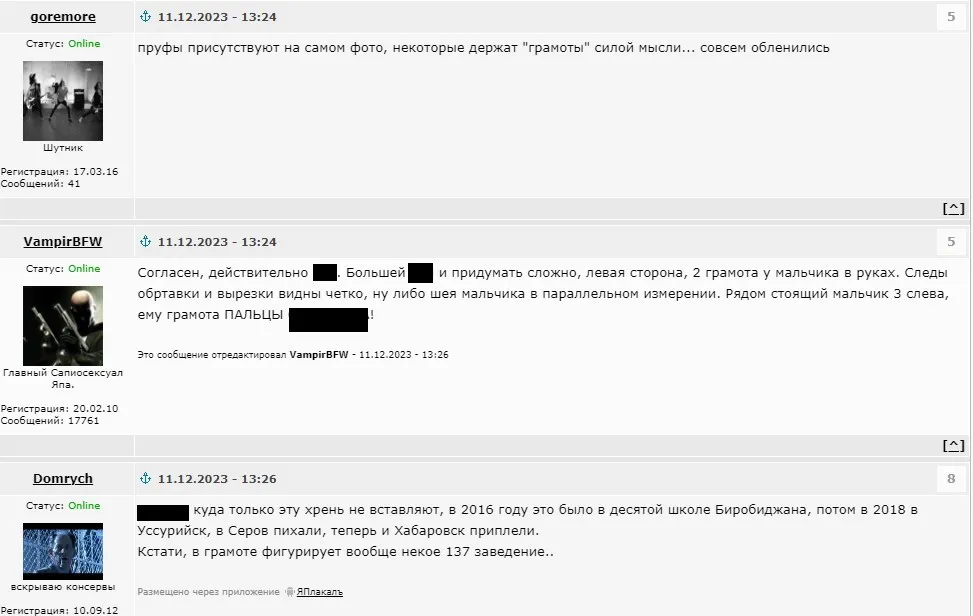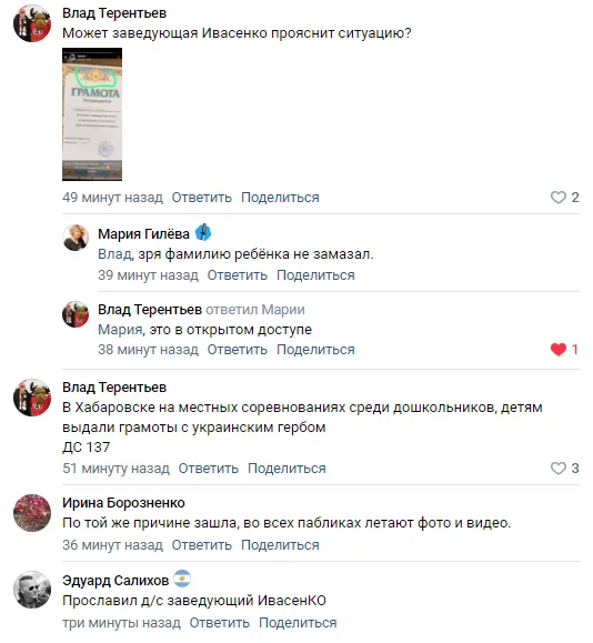 Последний громкий инцидент с украинскими почётными грамотами в российском детском саду произошёл не так уж и далеко от Хабаровска — в Чите — осенью прошлого года. Тогда в читинском детсаду № 73 детям выдали грамоты с изображением герба Украины за участие в конкурсе «Мисс и мистер лето — 2022». Выяснилось, что воспитательница нашла бланки для грамот в Сети и «распечатала не глядя». Директор и воспитательница после этого были уволены за «халатность».