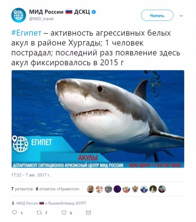 При этом в ведомстве добавили, что последний раз акулы были замечены у берегов курорта в 2015 году. Тогда акула откусила ногу немецкому туристу, отдыхавшему на египетском курорте Эль-Кусейр, расположенном в 130 километрах от Хургады. По дороге в больницу он скончался. С 2010 года это был первый случай нападения акулы на человека в Египте.