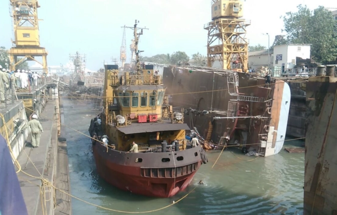 Как сообщает индийский телеканал NDTV, когда док начали заполнять водой перед выводом, корабль завалился набок.